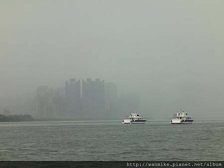 往另一邊看卻雨霧瀰漫,遠方的建築物被霧氣包圍,