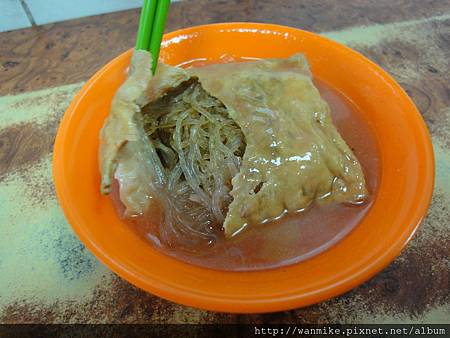 噹噹,這就是淡水阿給外面是豆皮,裡面是冬粉的感覺,再加上外面喝起來蠻特別的湯汁