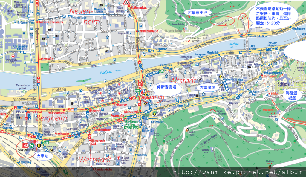 另外這裡可以下載海德堡的地圖(含各公車路線-地圖裡面用正方形框框 框起來且上面有標數字的就是他們的公車號碼)